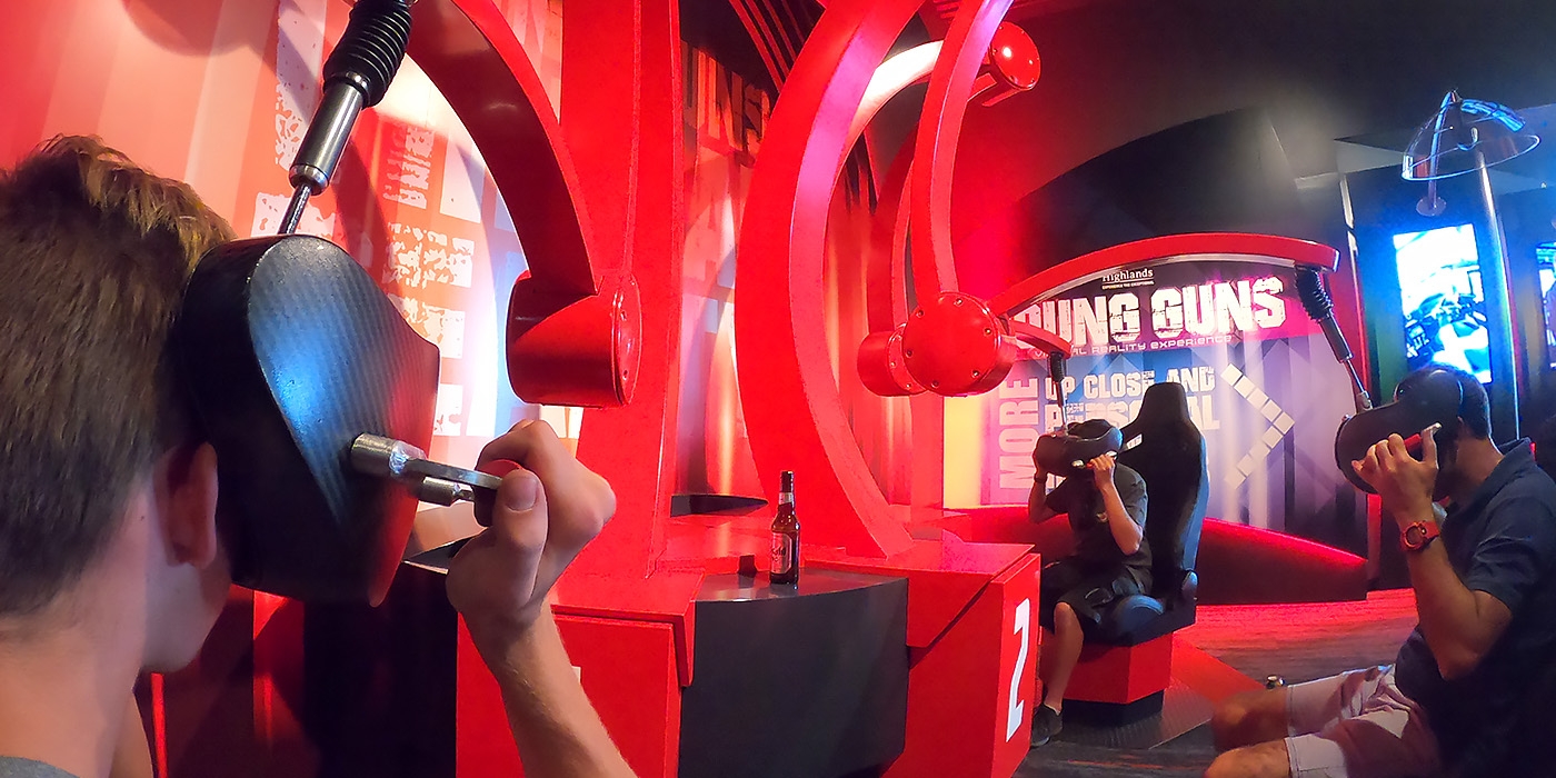 Earthstory's exclusive VR hardware configuration enables industrial-strength custom headset housings to float weightlessly in position and allows visitors to hold a headset against their face to enjoy fully articulated viewing.